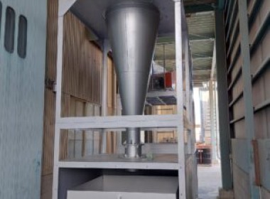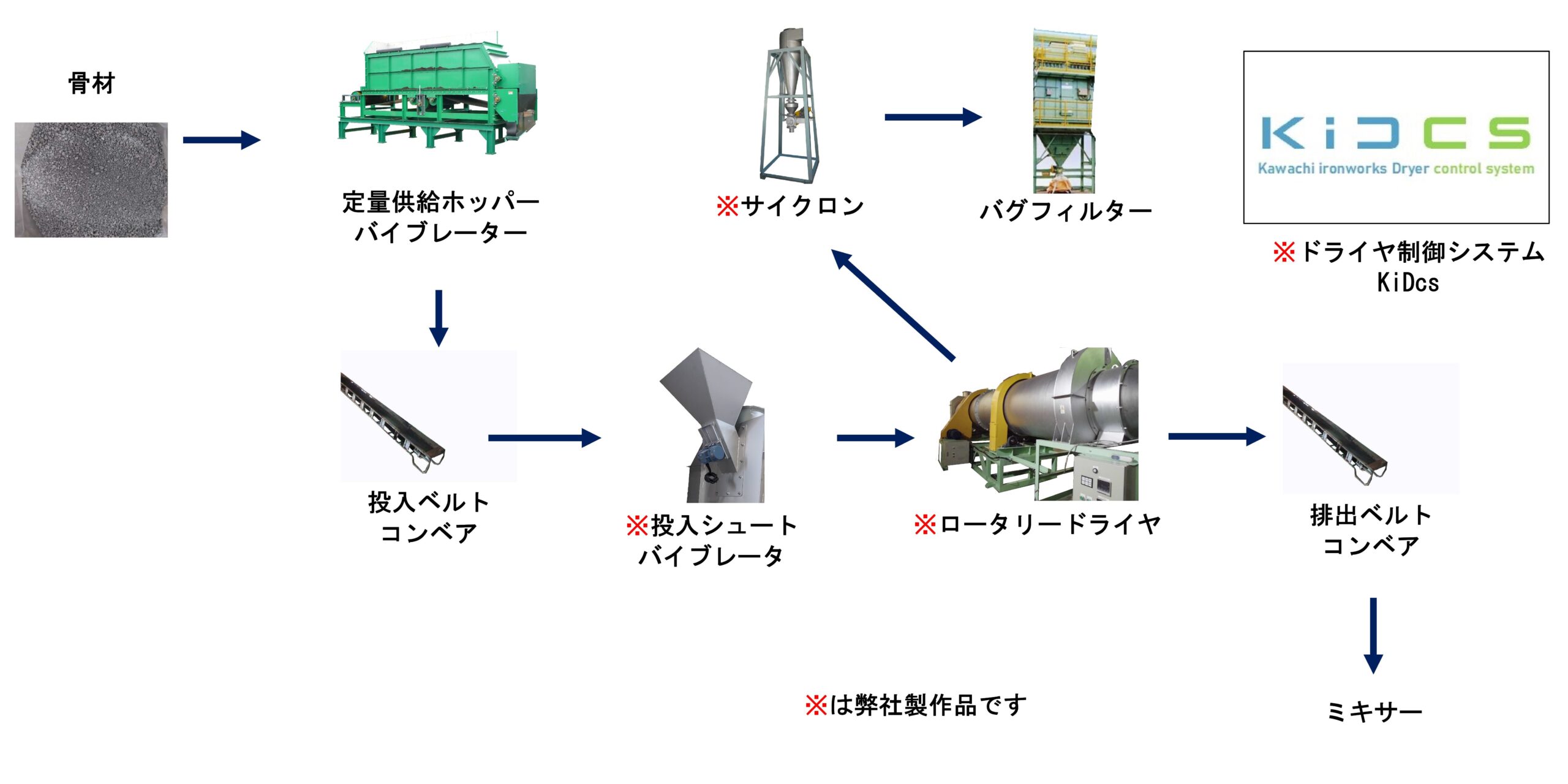 ロータリードライヤで乾燥後はベルトコンベアでミキサーに投入。排気処理はサイクロンで粉塵を粗取り後、バグフィルターで集塵した。