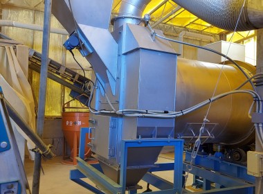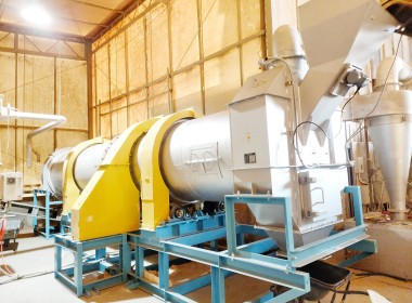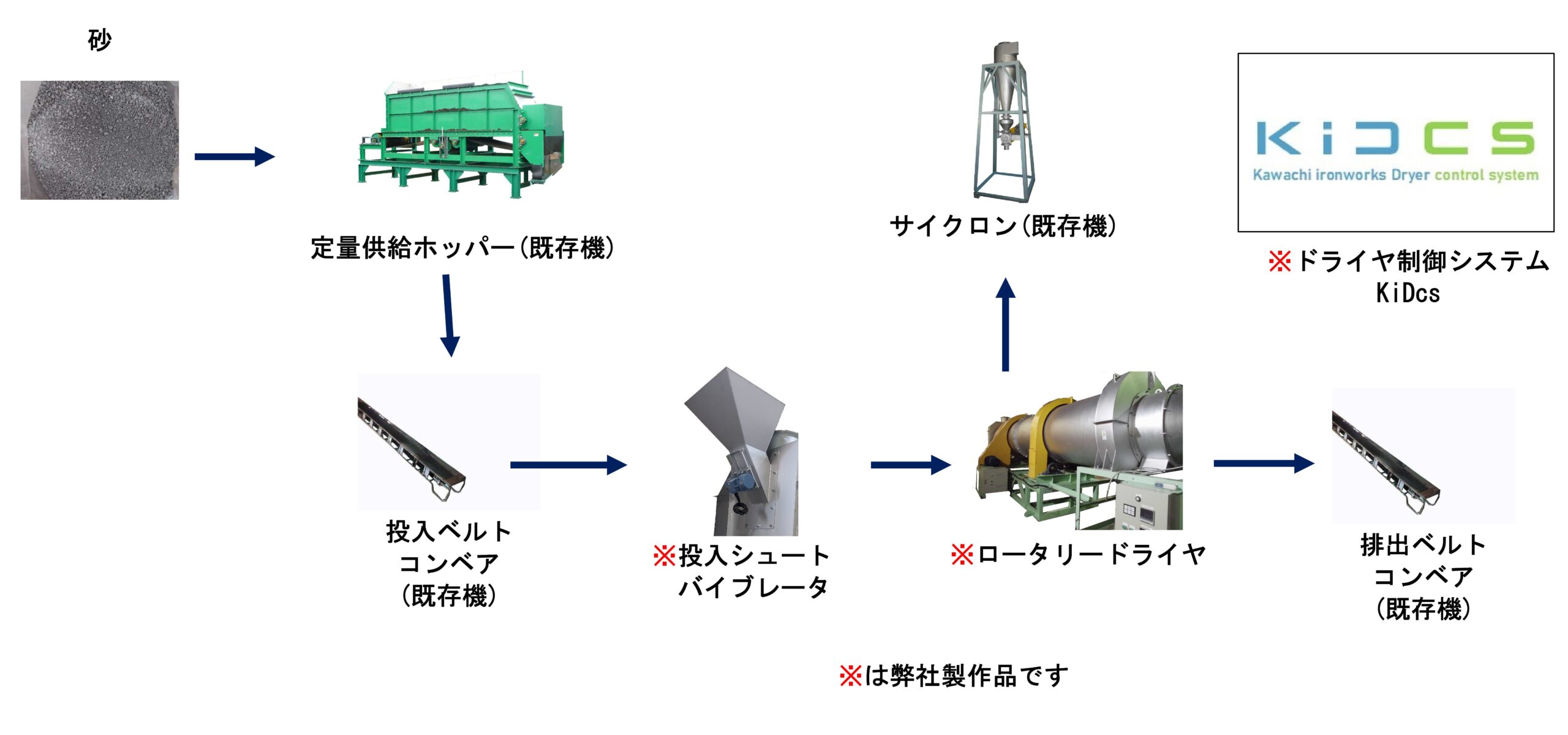 ロータリードライヤで乾燥後はベルトコンベアで振るい機に投入。排気処理はサイクロンで集塵した。